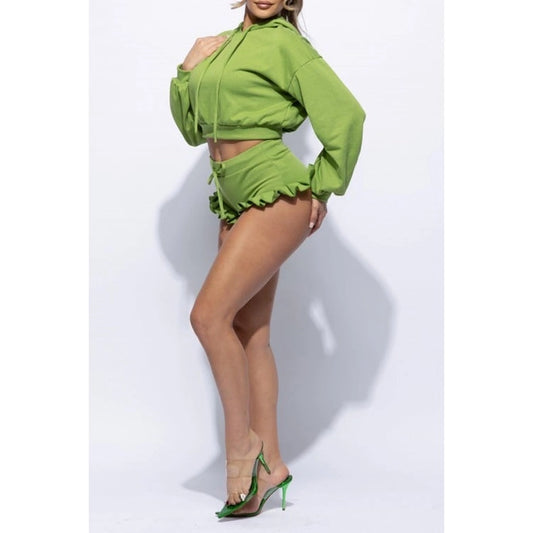 Sexy Sporty Crop Hoodie Top and Ruffled Shorts Set